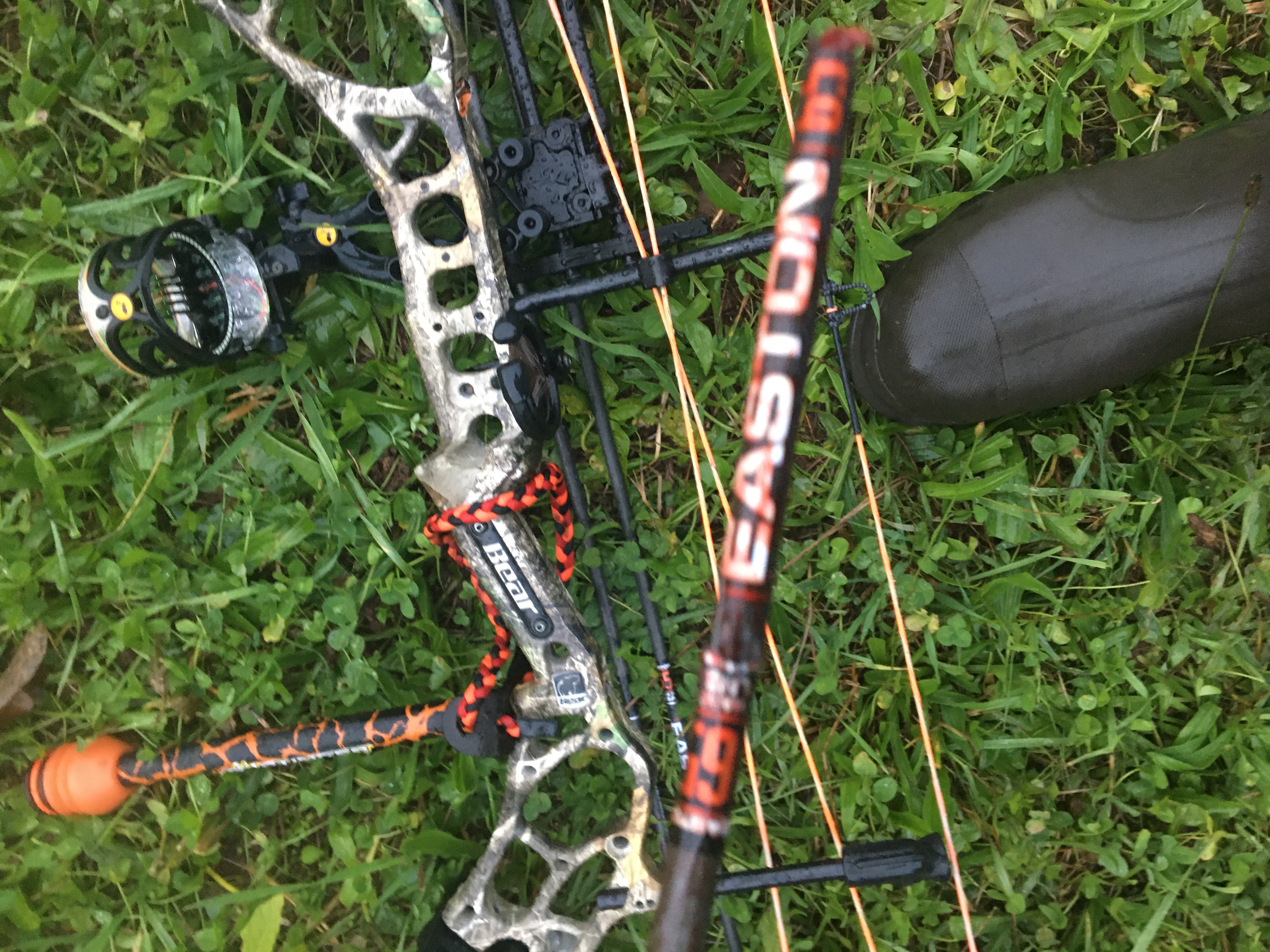 I continued up the creek bed getting more wet as the rain never stopped, but went through small waves of heavy to steady rain. It was one of those days where you can’t decide if under the trees where large droplets are falling off of the leaves onto you, or the steady small rain drops in the open are getting you more wet, there was no avoiding it. I continued up the creek thinking, “I wanna get home, and dry”. I walked up to a creek junction, and past it, the field I am coming up to is where I shot my deer last season, and where I had sat the night before and seen many deer. I think “I may as well take a look into this field and see what’s happening”. I slowly walked up the small creek bed embankment up to a cut grass field with cut corn on the far side about 150 yards away. My first glance was a few deer at about 80 yards on the right edge of the field. The next sight was two small deer in the center of the field, also far away. I stood up a little taller, and saw a dark horizontal line and dark shadow, close to me, within 20 yards. I crouched down, took two steps closer, stood up and drew my bow all at once. I looked at the deer while its head was down, I had to identify its gender/size before shooting it. I took my sight and looked at her head, and confirmed it was a doe, a good size one at that. At this point I regrouped with my bow, because of adrenaline and my position, I drew with a straight arm, and poor grip. Thankfully the wind was helping me, and she was busy chewing grass and clover. I aimed on the front quarter, and let the arrow fly. It sounded like the arrow hit a brick wall, she bolted forward, she ran about 30 yards and into the field edge along where I was standing. At that moment in the pouring rain I took a deep breath, watched where she had gone, and thought about giving her time to pass away. I slowly walked across the field, caddy cornered to where she went, and back to my house a few hundred yards away. I regrouped in my garage, took my wet gear off, put dry pants on, and an extra rain jacket on. Thanks to technology and loyalty two of my local buddies were there within 30 minutes of my shot. In the pouring rain we crossed the now muddied creek from rainfall, and back onto the field. We approached where I shot her, and had previously located the bloody fletching and broken arrow. It had fully passed through, and was sticking out of the loose muddy dirt.